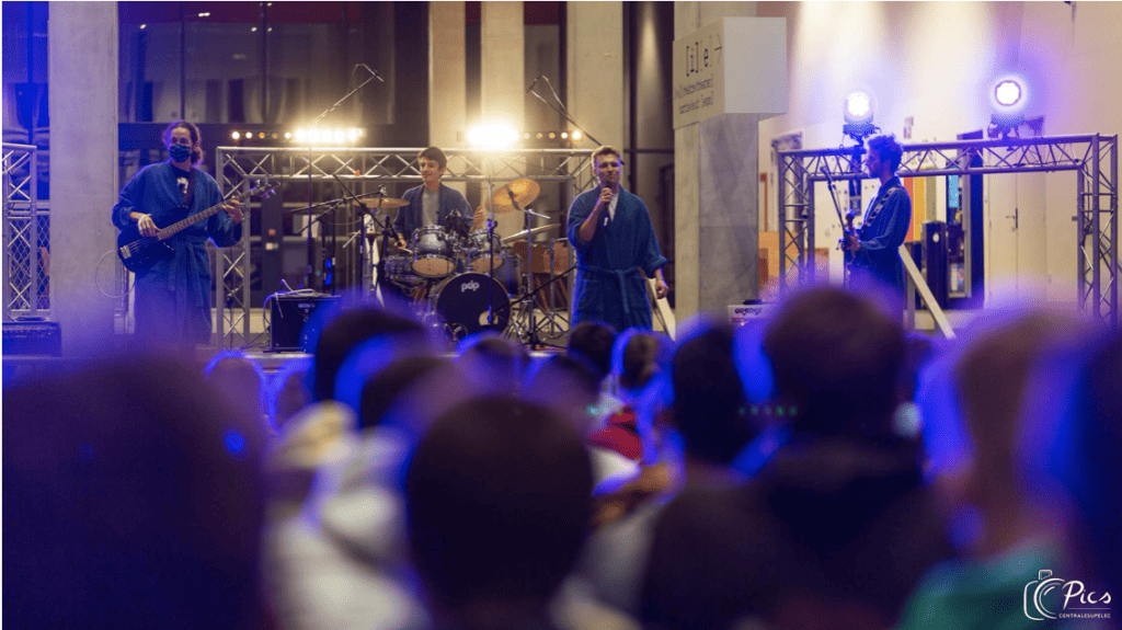 Eitan : On s’est regroupé en une semaine parce que l’un des premiers jours, je vois qu’Aimé est batteur et je me dis « Oh, un batteur, y’en a pas beaucoup » donc je lui dis « vas-y go, on fait un groupe ensemble ». Il nous faut un bassiste, donc j’ai demandé à Nestor et ce qui était très drôle c’est quand il a fallu trouver un chanteur. On avait demandé à tout l’amphi et tout le monde disait « Ah non désolé, moi je chante pas, je sais pas chanter ». On finit par demander à Jérémy et il dit « Je sais pas… » donc on lui dit « écoute, tu viens avec nous à la répét’, tu vois si ça te plait et comme ça on décide ». A la fin de la première répét’ on se dit « Go, on fait un truc tous les quatre, ça marche bien ». Du coup, on est tous les quatre fans de rock à la base donc ça a été assez facile au début de jouer des choses dans ce répertoire là. Donc, même si le rock c’est évidemment très large, on a essayé de jouer plusieurs trucs à partir d’un an/un an et demi. On a essayé de faire quelques compos aussi.